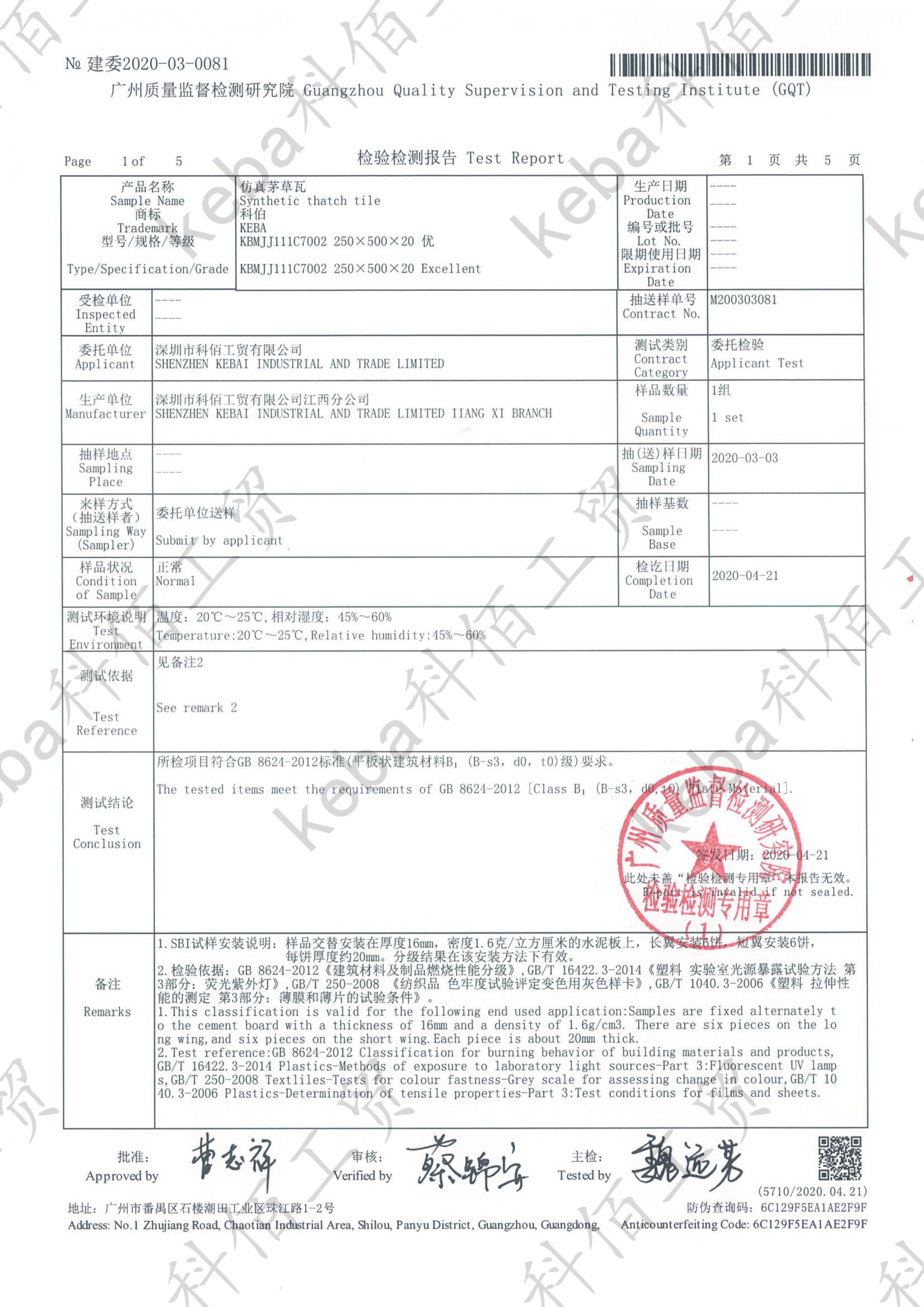 2020年科佰又成功通過廣州質量監(jiān)督檢測研究院對仿真茅草瓦產品進行檢測,再一次證明科佰產品的質量過硬,經得起考驗。